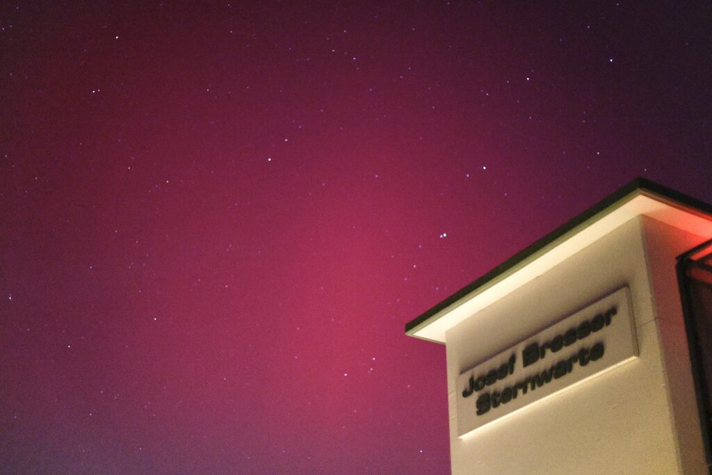 Der Dienstag war ein müder Tag. Die Aktivität des Sonnenwinds war aber noch hoch. Ich war hin und hergerissen. Sollte ich lieber schlafen gehen oder nochmal los? Ich packte alles zusammen und fuhr ins Schwarze Venn. An meinem Beobachtungsplatz stand ein Traktor, der hell beleuchtet arbeitete . Damit hatte ich nicht gerechnet. Es war ja schon 19:30 Uhr. Aber egal, ich fuhr einige hundert Meter weiter, bog in einen Feldweg ab und postierte mich völlig abgelegen an eine Wieseneinfahrt. Auf den ersten Aufnahmen konnte man das Polarlicht gut erkennen, dann auch wieder visuell. Es war weitaus schwächer als am Tag zuvor. Dennoch war es schön. Nach der ersten Welle wartete ich noch auf Weiteres . Aber es blieb dabei. Gegen 21 Uhr kamen noch zwei junge Männer mit dem Auto vorgefahren, stellten ihre Kameras auf. Sie wollten ebenfalls dem Spektakel beiwohnen. Laut ihrer App auf dem Handy sollte Polarlicht zu sehen sein. Ein Karte mit Sichtungen , die gerade oder nur wenige Minuten alt waren, sah man auf dem Display ihres Handys. Ich hatte schon seit einer halben Stunde nichts mehr gesehen. Auch das Polarlichtforum konnte keine Sichtungen melden. Das ist schon verwunderlich. Ich habe keine Ahnung, was die Leute da gesehen haben. Polarlicht wird es nicht gewesen sein. Ich packte meine Sachen jedenfalls zusammen, zumal der Himmel immer wolkiger wurde. In der Nacht zum Mittwoch gegen 0:30 Uhr ist anscheinend wohl noch mal Aktivität zu sehen gewesen. Bei uns war der Himmel aber bewölkt. Also hatte ich nichts verpasst.