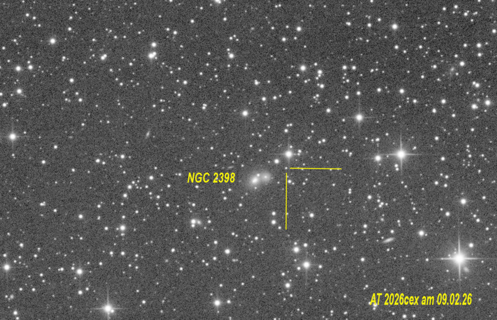 Am 30. Januar 2026 entdeckte der japanische Astronom Masaki Tsuboi einen neuen Stern in der Nähe der Galaxie NGC 2398. Die Galaxie ist eher gewöhnlich , besitzt eine Helligkeit von 14,4 mag und befindet sich im Sternbild Zwillinge. Der neue Stern aber , eine Supernova, zeigte einen sehr schnellen Helligkeitsanstieg und war schon bald heller als 16 mag. Die Untersuchung des Spektrums brachte eine Rotverschiebung von z=0.029724 zu Tage . Die Zugehörigkeit zur Galaxie NGC 2398 mit einer Rotverschiebung von z=0.029517 war schon sehr naheliegend. Allerdings befindet sich die neue Supernova fast 2 Bogenminuten vom Zentrum der Galaxie entfernt. Die Galaxie ist etwa 400 Millionen Lichtjahre entfernt. Somit würde die Supernova ebenfalls 230.000 Lichtjahre entfernt vom Zentrum der Galaxie zu finden sein. NGC 2398 wäre schon sehr groß.