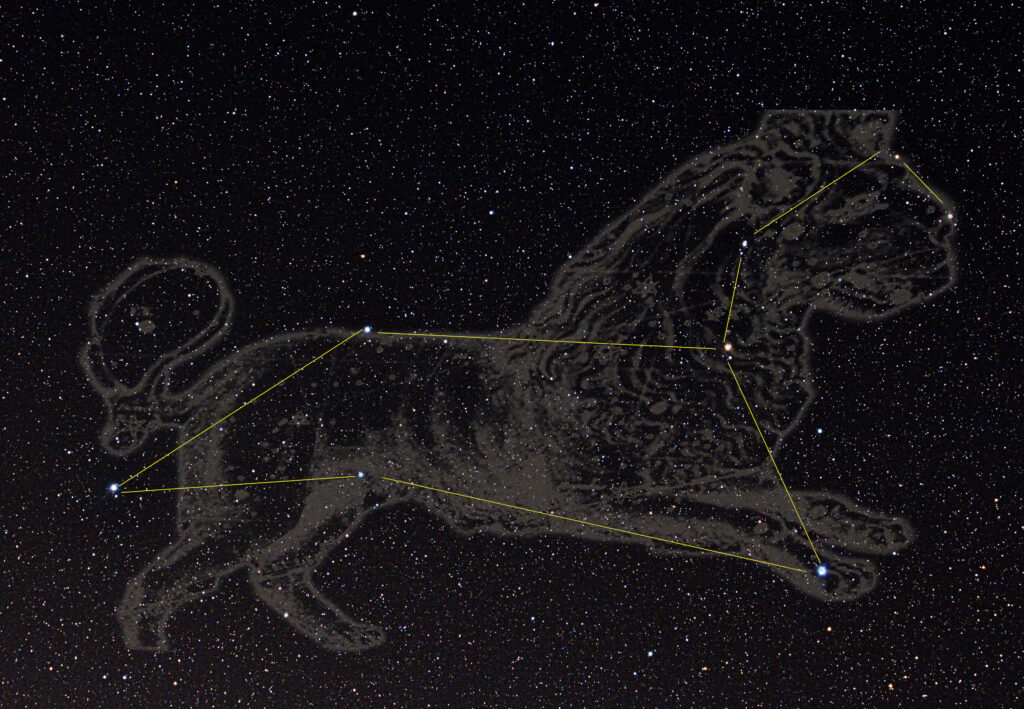 Der Frühlingshimmel wird durch das Sternbild des Löwen dominiert. Das Sternbild erinnert an den nemeischen Löwen der griechischen Mythologie. Die Raubkatze wurde von Herkules getötet, weil sie die Stadt Nemea bedrohte. Die Tötung war die erste seiner zwölf Aufgaben, die ihm auferlegt wurden. Die einprägsame Konstellation der Sterne zeigt einen ruhenden Löwen. In modernen Zeiten würde das Sternbild Löwe möglicherweise als Dampfbügeleisen deklariert werden, wenn man sich die Anordnung der Sterne anschaut. Immerhin wird der Große Bär volkstümlich auch gerne als Großer Wagen bezeichnet. Die hellsten Sterne des Löwen sind Regulus an der Vordertatze, Denebola am Schwanz und Algieba am Hals des Löwen. Auch die Sterne Zosma, Coxa und Aldafera gehören zu den Hauptsternen des Löwen. Die Sterne sind alle zwischen 35 bis 260 Lichtjahren entfernt und man würde sie zur erweiterten Nachbarschaft der Sonne zählen.